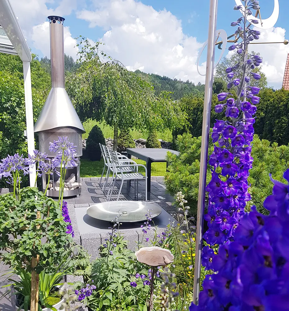 Kundenbild/Referenz: Eine wunderschöne Wasserschale aus Edelstahl umgeben von wunderschöner Natur. Wir haben die Wasserschale, die Technik und das Wasserbecken geliefert. Die Beckenabdeckung ist eine Eigenkreation des Kunden. Der Einbau des Gartenbrunnens erfolgte bauseits.