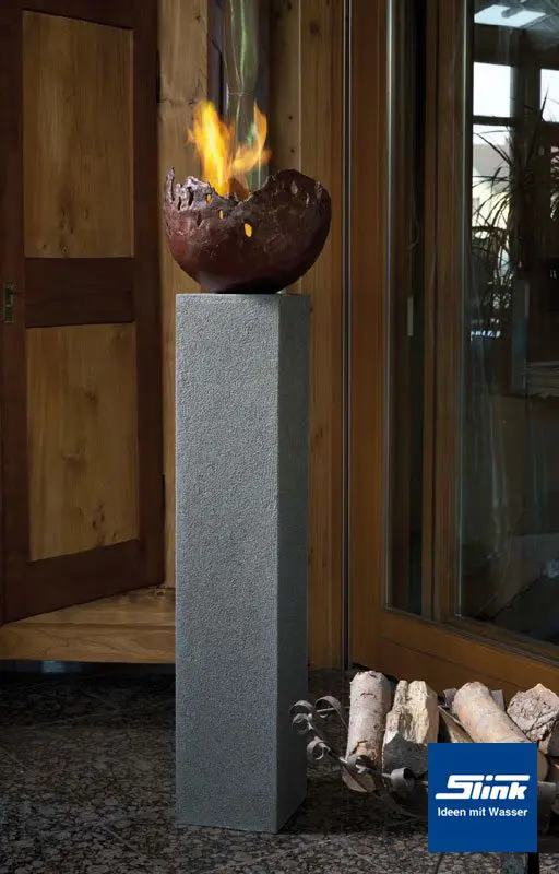 Eine dekorative und kunstvolle Feuerschale aus Bronze einer ca. 1 Meter hohen Granitstele. Die Schale für Feuer hat einen Durchmesser von ca. 33 cm und eine leichte Patina in Grau- und Silbertönen. Ein extravagantes Objekt auf einer feingestockten Granitsäule mit angerauter Oberfläche. Feuerschale und Granitstele können auch einzeln bestellt werden.