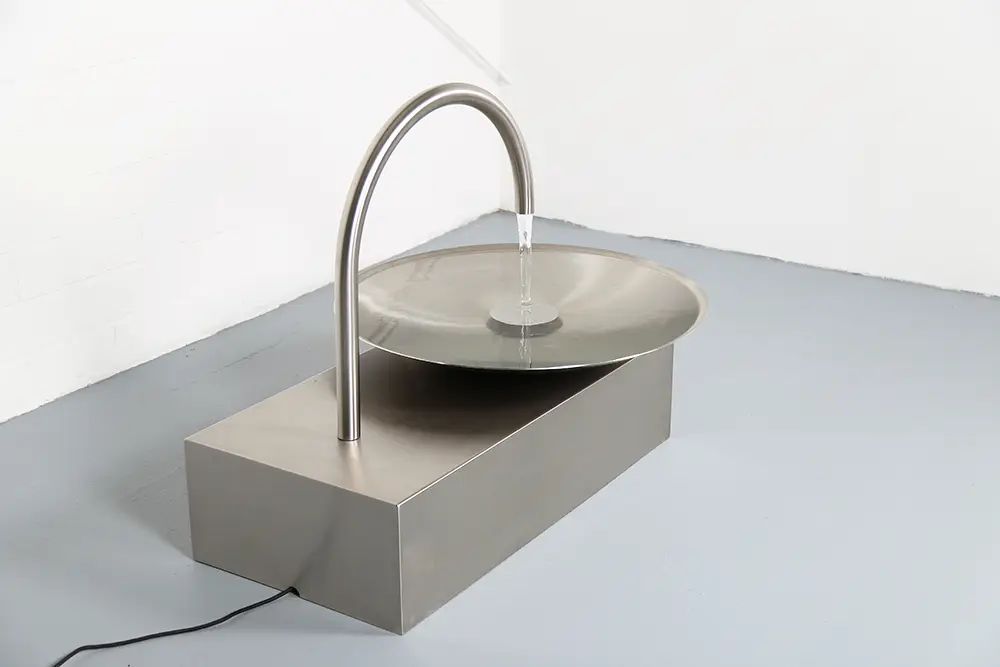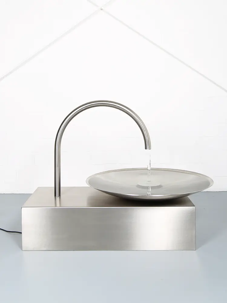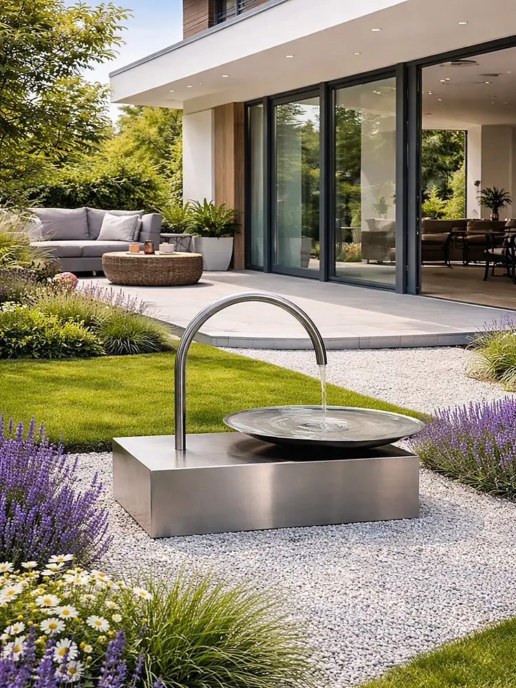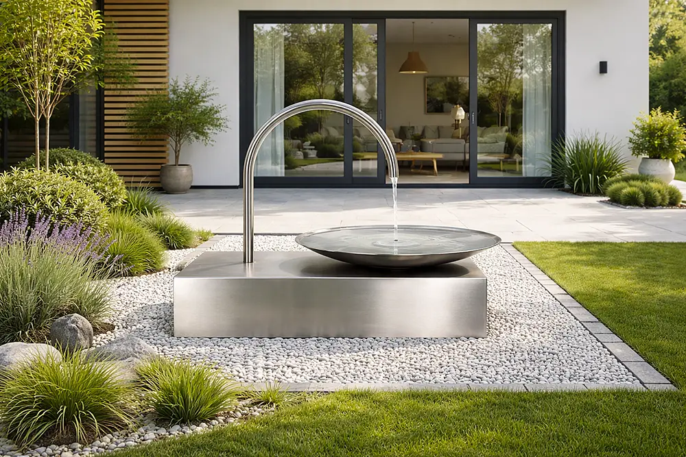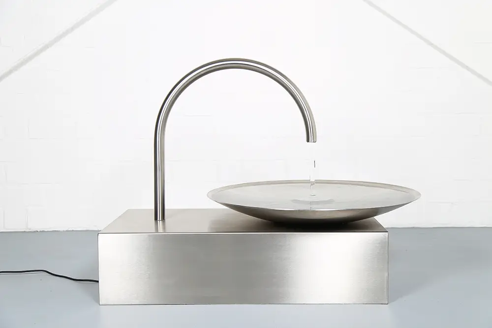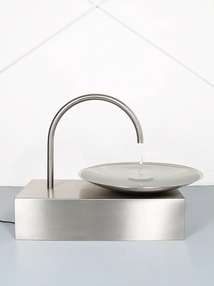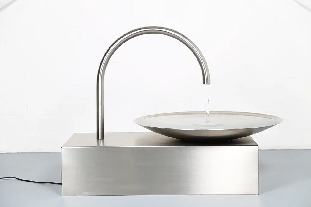 Das Wasser fließt aus einem elegant geschwungenen Edelstahl-Auslauf in eine große, flache Schale. Dort entsteht eine ruhige Wasserbewegung, die das Licht reflektiert und gleichzeitig ein angenehmes, beruhigendes Plätschern erzeugt. Durch die minimalistische Gestaltung wirkt der Brunnen wie eine moderne Skulptur und fügt sich perfekt in zeitgemäße Gartenkonzepte, Architektur-Gärten oder designorientierte Außenbereiche ein.