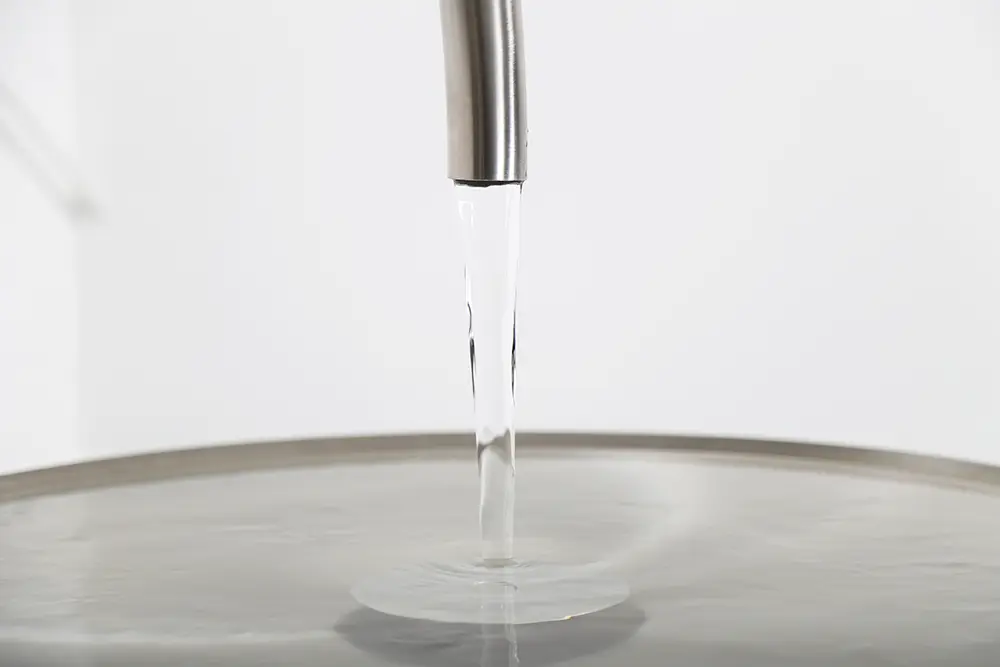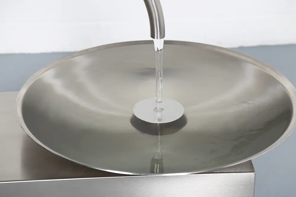 große, flache Edelstahlschale mit ruhiger Wasseroberfläche
