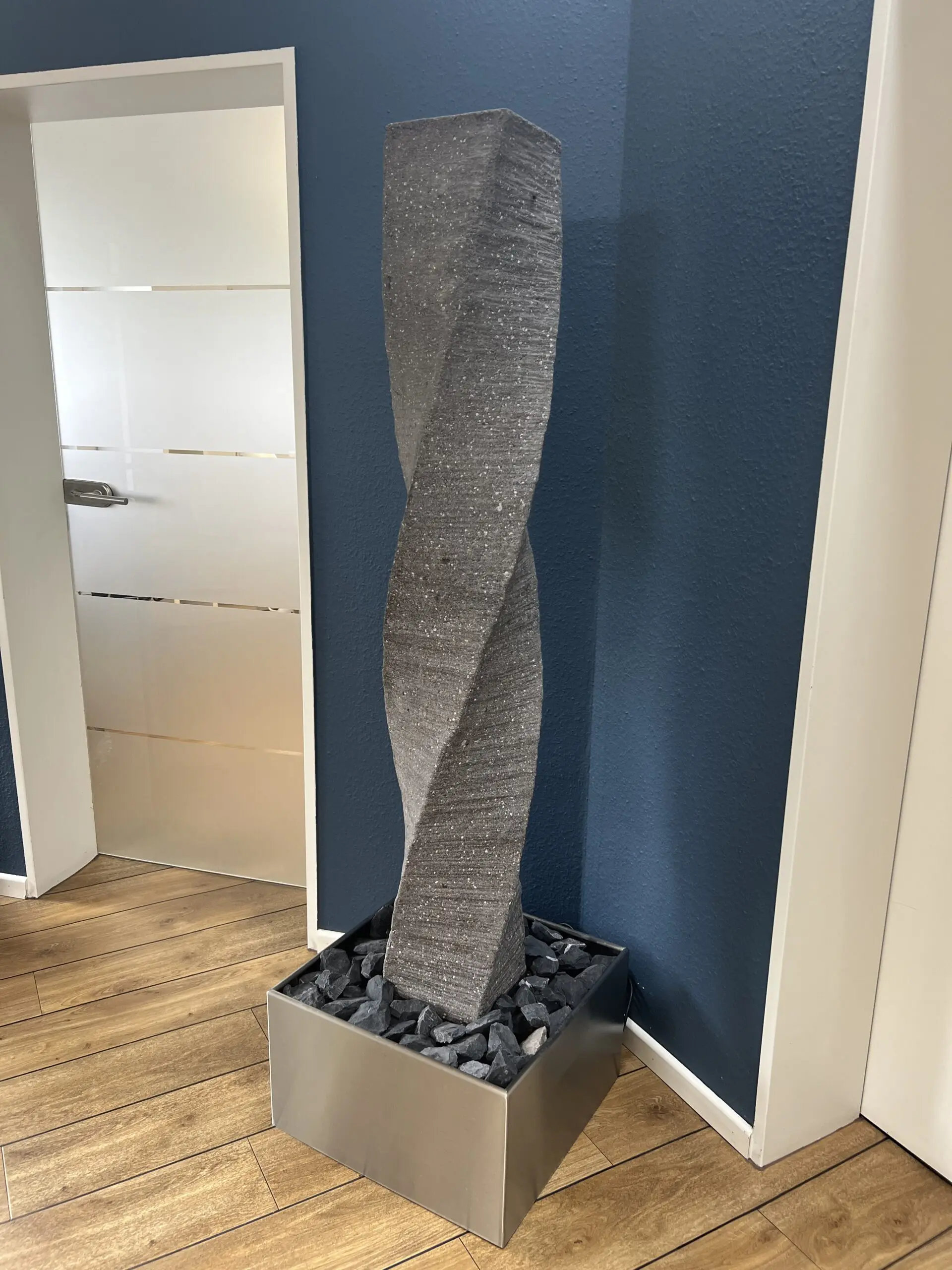 Twister ist Zierbrunnen in Steinoptik, der in sich gedreht ist und damit einen tollen Wasserlauf erzeugt. Die Farbe ist grau, die in Richtung Granitoptik geht. Ein leichter und schmaler Springbrunnen, der sich für viele Orte im Garten eignet und durch sein Wasserspiel immer wieder neue Perspektiven bietet. Beim Material handelt es sich um in Handarbeit gefertigte Unikate aus robustem Verbundwerkstoff bestehend aus Glasfaser, Sand, Zement und anderen Additiven. Die großen Vorteile sind, dass sie verhältnismäßig leicht, winterfest und überall schnell aufstellbar sind! Hier als Aktionsprodukt in einer Sondervariante mit Aufstellbecken inkl. Edelstahlumrandung. Beim Anschalten kann es zu Spritzwasser kommen. Wir empfehlen daher den Betrieb des Brunnens im Außenbereich. Bilder vom Aktionsprodukt: Bilder 1-4.
