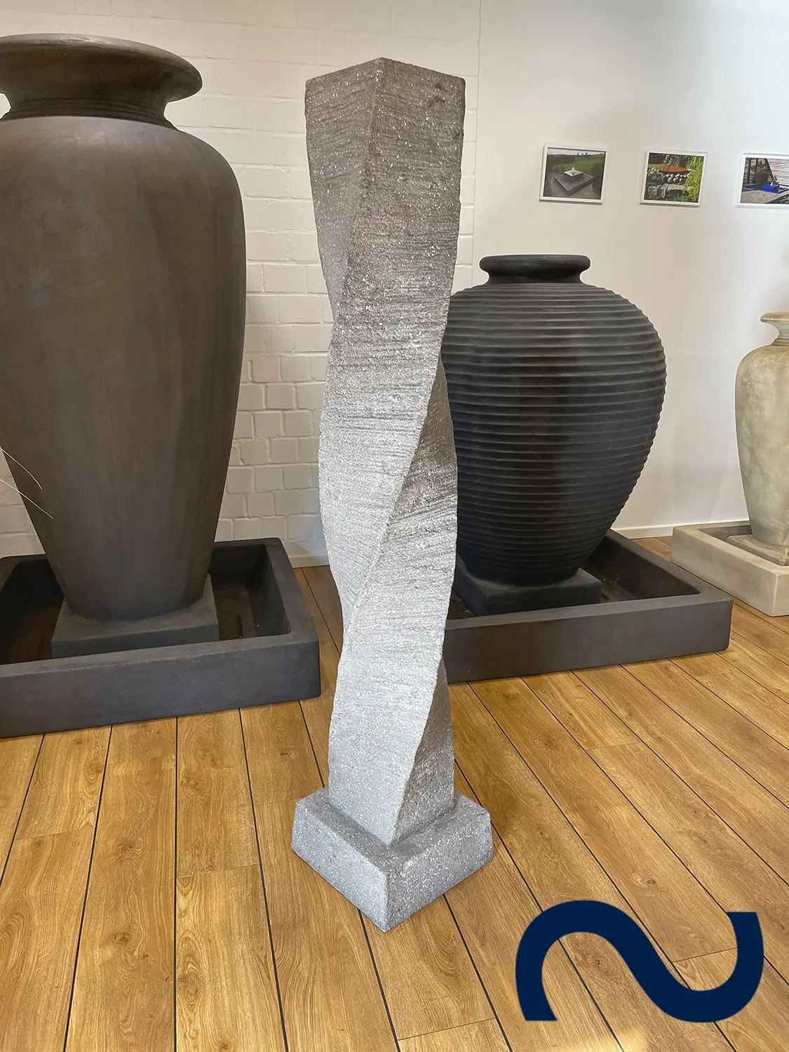 Twister ist Zierbrunnen in Steinoptik, der in sich gedreht ist und damit einen tollen Wasserlauf erzeugt. Die Farbe ist grau, die in Richtung Granitoptik geht. Ein leichter und schmaler Springbrunnen, der sich für viele Orte im Garten eignet und durch sein Wasserspiel immer wieder neue Perspektiven bietet. Beim Material handelt es sich um in Handarbeit gefertigte Unikate aus robustem Verbundwerkstoff bestehend aus Glasfaser, Sand, Zement und anderen Additiven. Die großen Vorteile sind, dass sie verhältnismäßig leicht, winterfest und überall schnell aufstellbar sind!