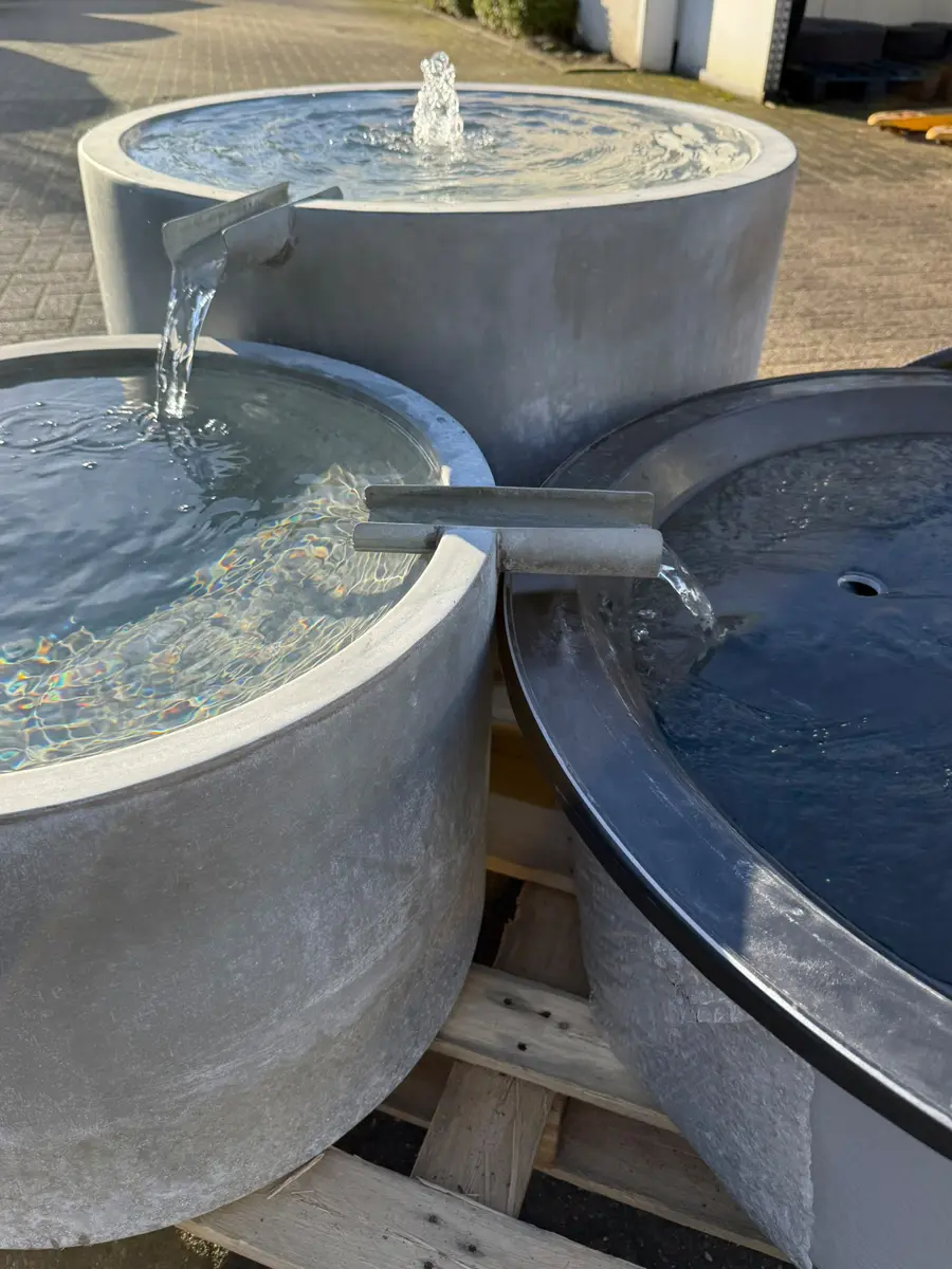 Schöner Zink-Wasserfall in runder Form. Das Wasser kommt aus der Zink-Quelle mit kleiner Wasserfontäne und läuft über einen Überlauf in die nächste Zinkschale. Hier läuft das Wasser weiter in das GFK-Wasserbecken, was im Gegensatz zu den gezeigten Fotos, ins Erdreich eingelassen wird. Auf die GFK-Abdeckplatte für das GFK-Wasserbecken werden bauseits noch Steine gelegt, sodass es ein sehr schönes Bild ergibt, wenn das Wasser aus dem Überlauf auf die Steine plätschert. Im Wasserbecken befindet sich eine Schlauchdurchführung, sodass der Schlauch unsichtbar (im Gegensatz zu den Fotos) wieder vom Becken zurück zur Zink-Quelle geführt werden kann. So entsteht der Kreislauf.