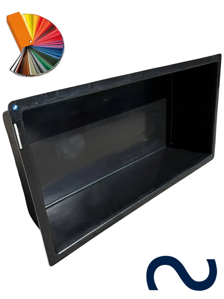 Rechteckiges GFK-Wasserbecken / Fertigteich / Teichbecken mit ca. 160 x 80 x 35 cm mit ca. 330 Liter Fassungsvermögen. GFK steht für das Material glasfaserverstärkter Kunststoff, welches sehr robust und langlebig ist und sich daher optimal für den dauerhaften Einsatz als Wasserbecken im Garten eignet. Sie finden bei uns GFK-Wasserbecken in verschiedenen Formen (runde Teichbecken, eckige Teichbecken, quadratische Teichbecken, rechteckige Teichbecken). Auch Maßanfertigungen sind in den meisten Fällen möglich – kontaktieren Sie uns hierzu einfach. Sonderfarben der GFK-Becken in vielen RAL-Farben gerne auf Anfrage. Die Abbildungen sind beispielhaft und können vom tatsächlichen Produkt abweichen.